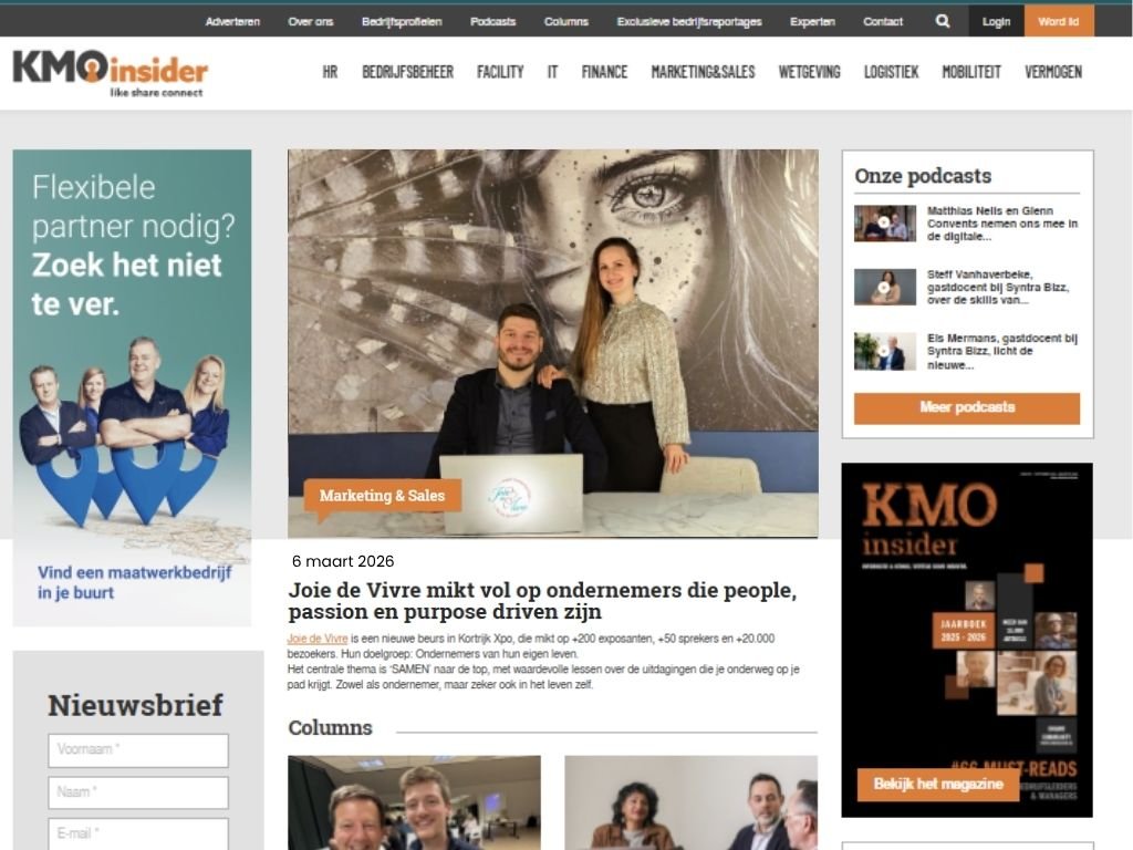 Als kmo word je vaak geconfronteerd met verschillende ondernemersvraagstukken of problemen. Met KMOinsider willen wij een informatiebron zijn en kmo’ers met elkaar verbinden om zo de gepaste oplossing te bieden en elkaar bij te staan. Dit magazine en online platform verbindt een community van ondernemers die samen sterk staan. Een professionele pen legt je verhaal vast. Messcherpe teksten worden SEO-proof geschreven of worden uiteen gezet in interessante artikelen in het magazine.