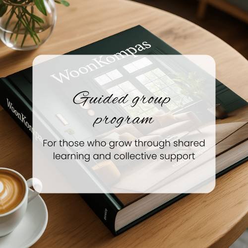 Dit traject combineert de kracht van het WoonKompas met de energie van een kleine groep. Je krijgt toegang tot alle online materialen én begeleiding in live sessies, zodat je telkens helder weet wat je volgende stap is. De groep biedt herkenning, inspiratie en gedeelde vooruitgang.